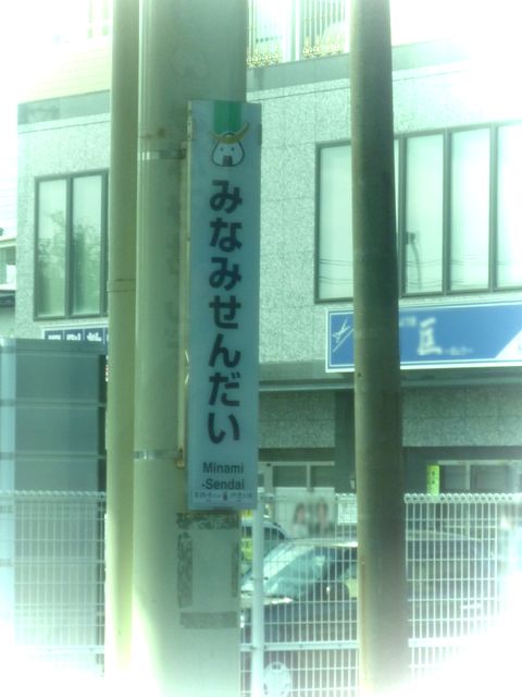 駅の名札?に、仙台のキャラクターむすび丸が…。