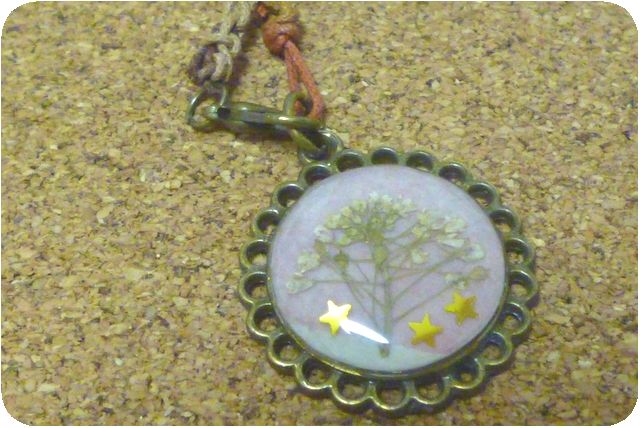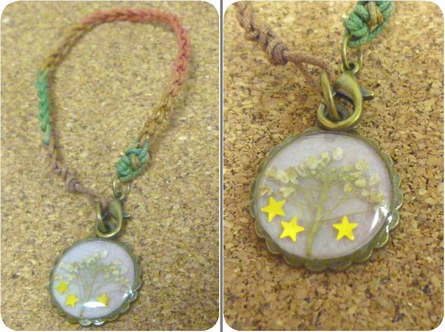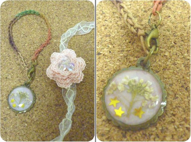 ナズナの押し花入りアクセサリー と、編んだお花。