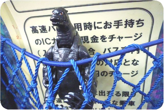 ゴジ郎乗車。前席の網ポケットにイン。